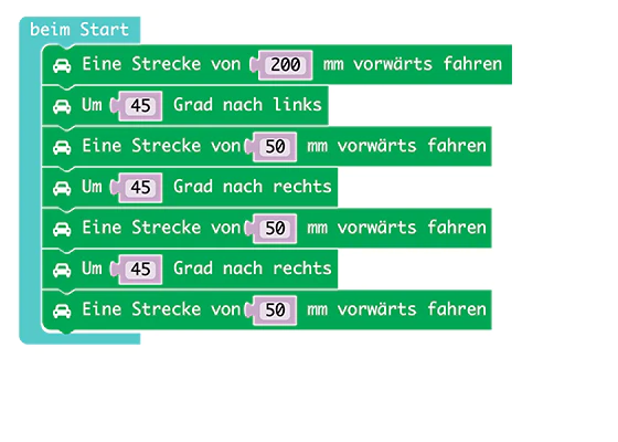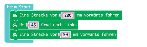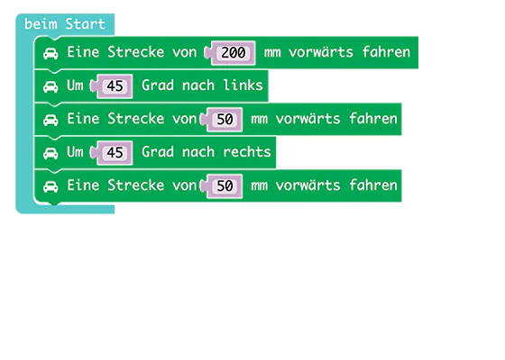 Beginne mit einer Strecke, indem du den Block “Eine Strecke von () mm vorwärts fahren” nimmst und z.B. den Wert 200 als Parameter einsetzt. Dann nutze den Block “Um () Grad nach links” und gib eine Gradzahl an, die sinnvoll ist. Danach nutzt du nochmal den ersten Block. Nun sollte dein Auto fahren, sich etwas drehen und anschließend weiterfahren.