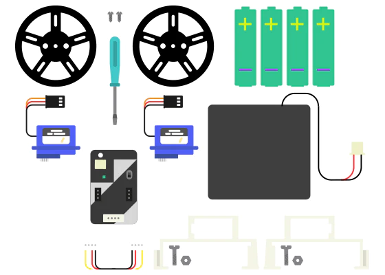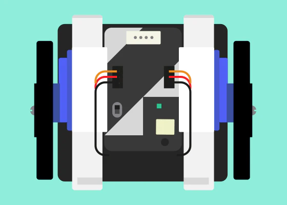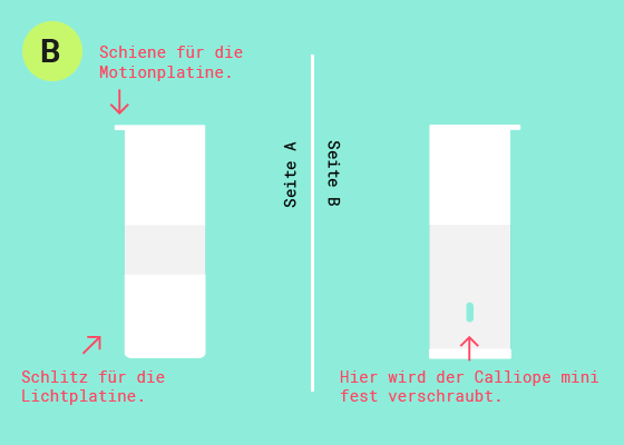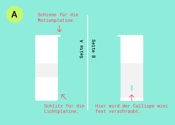 Die Karosserie verwandelt deinen Roboter in ein neues Gefährt. Die offene Seite wird mit dem Calliope mini abgeschlossen. Die beiden Seitenteile werden jeweils an den Servos befestigt. Um die Pappe befestigen zu können, müssen die Reifen noch einmal von den Servos gelöst werden.