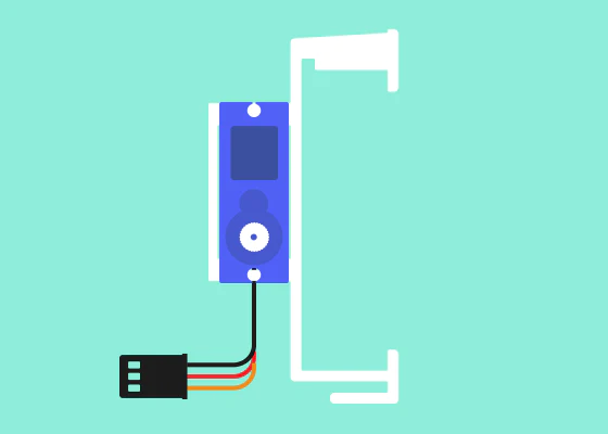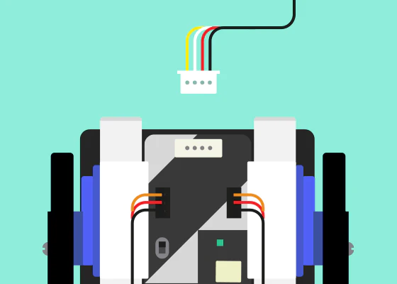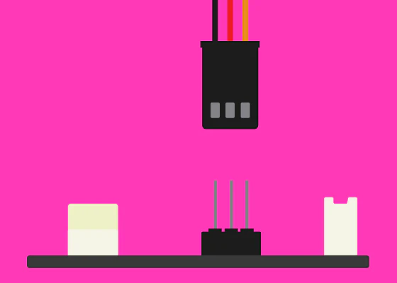 Die Stecker der Servomotoren passen genau auf die Pins auf der Platine. Achte darauf, dass du sie in der richtigen Richtung verbindest. Das gelbe Kabel sollte jeweils an der Seite des großen Konnektors und den Punkten sein.