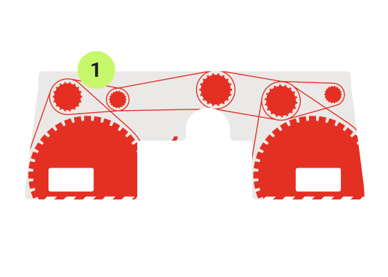 Die beiden Schienen für die Motionplatine müssen zueinander zeigen! Die Servos mussen jeweils so plaziert werden, dass das Kabel auf der Seite der Nut ist und durchgeführt wird und das Rädchen des Servos für die Reifen außen ist.